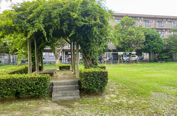 山口県防府市にある三田尻(みたじり)公園です。 公園内にある大きな木が特徴です。 遊具やベンチも設置しています。公衆トイレあり。 隣に三田尻御茶屋旧構内 英雲荘があります。