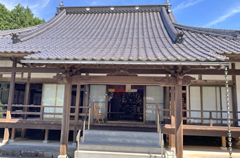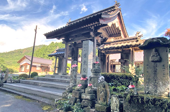 地福駅のそばにある寺院の桂光院 山門脇には赤い前掛けをつけたお地蔵様がお出迎え。