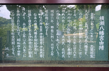 山口県宇部市にある横瀬八幡宮(よこせはちまんぐう)です。 1327年(嘉暦2年)に創建され、1969年(昭和44年)に山口県指定有形文化財に指定された祭神の応神天皇の母、神功皇后の武勲や八幡宮の創立記などを、絵と詞書で交互に記した『紙本着色八幡縁起絵巻』が木箱に収められています。 毎月5月頃に横瀬八幡宮周辺でホタル祭りが開催されます。