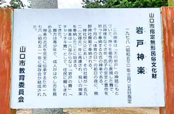 山口県山口市小郡上郷にある熊野神社になります。 【山口市指定無形民俗文化財】岩戸神楽 1978年3月25日指定 岩戸神楽は「天の岩戸」の神話にもとづいて、神々を個性的に表現した舞で、祈って奉納する古式の神楽になります。 この神楽は16座からなり「岩戸の舞」「チャンチキ舞」として住民に親しまれおります。 コチラの舞は10月の体育の日の前日の夜に行われます。 国道9号線沿いにあるJR仁保津駅から橋を渡りまっすぐ行けばいけます。